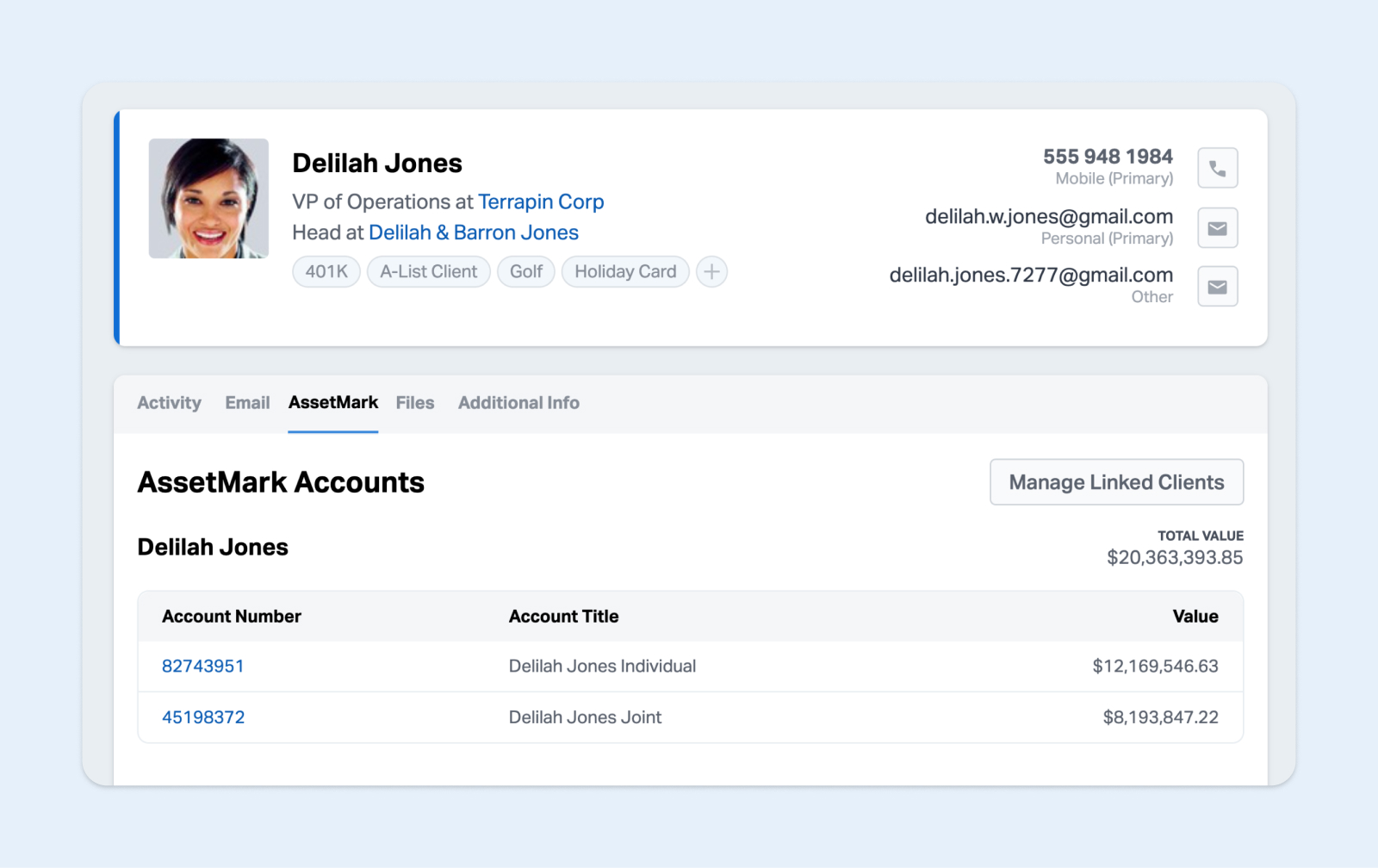 AssetMark is a trusted custodian that enables comprehensive financial account integration directly within Wealthbox. With this integration, advisors can effortlessly access and view their clients’ AssetMark account details, including holdings, values, and demographics, without switching tools.