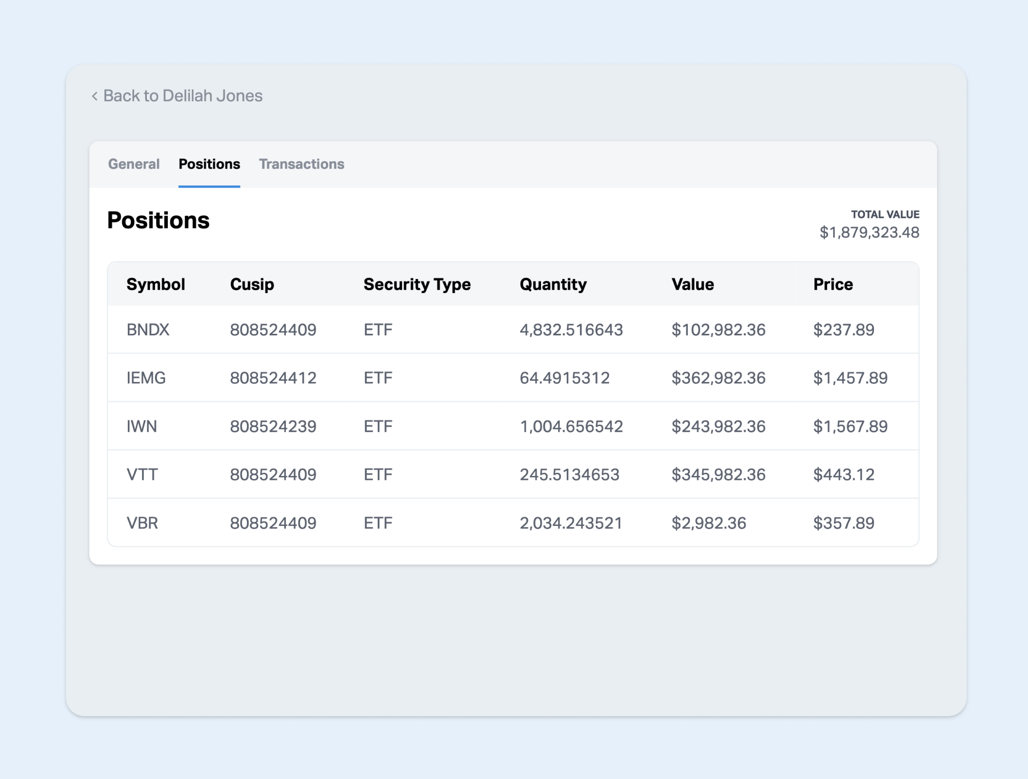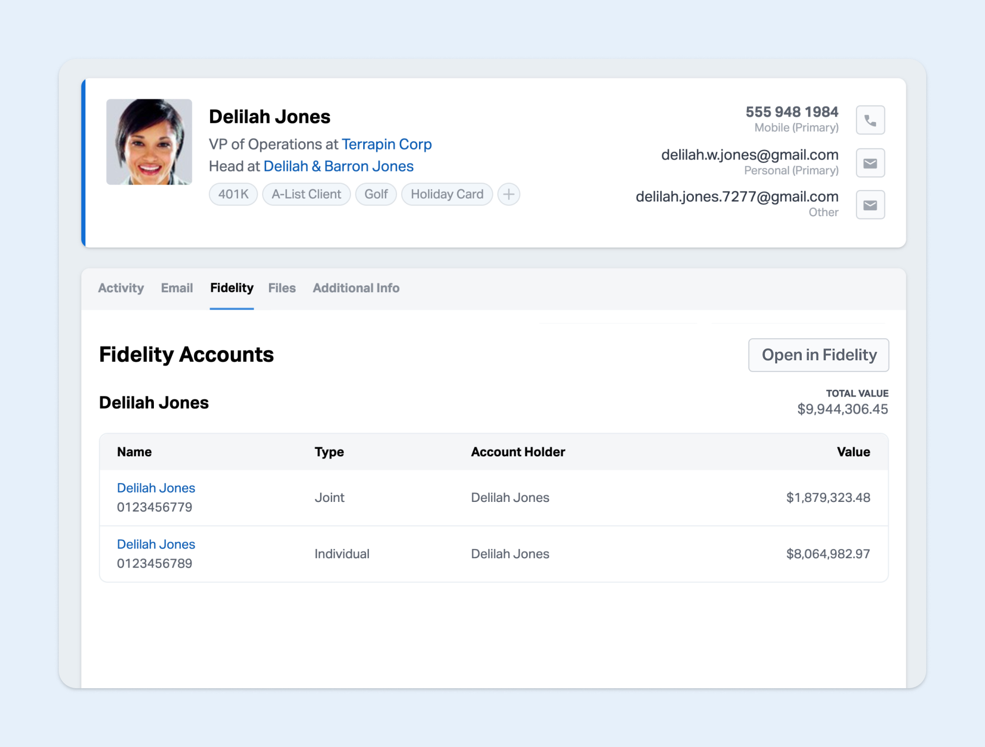 View key Fidelity account information directly within Wealthbox for a complete picture of each client relationship.