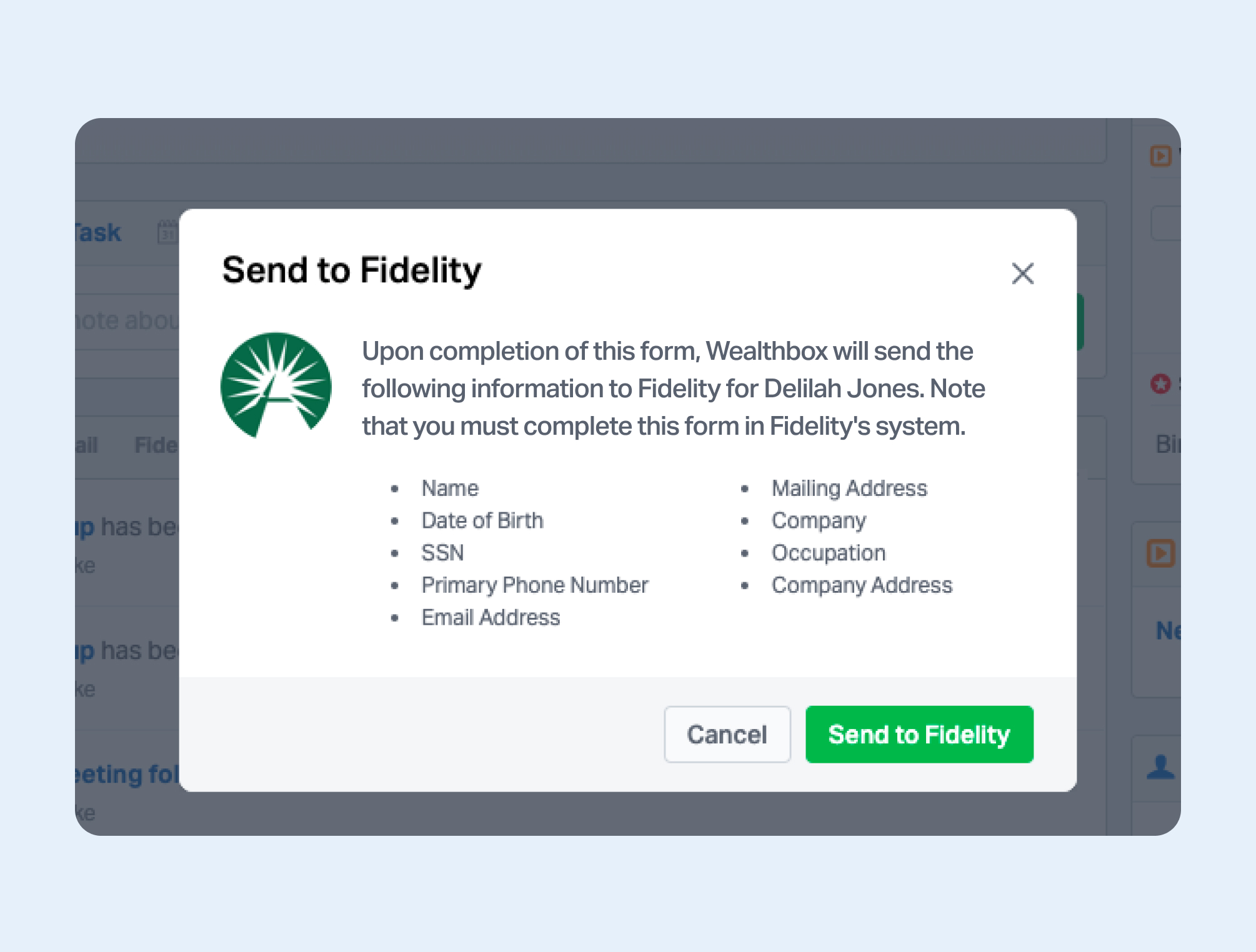 Send client and account information from Wealthbox to Fidelity with just a few clicks, reducing manual entry and errors.