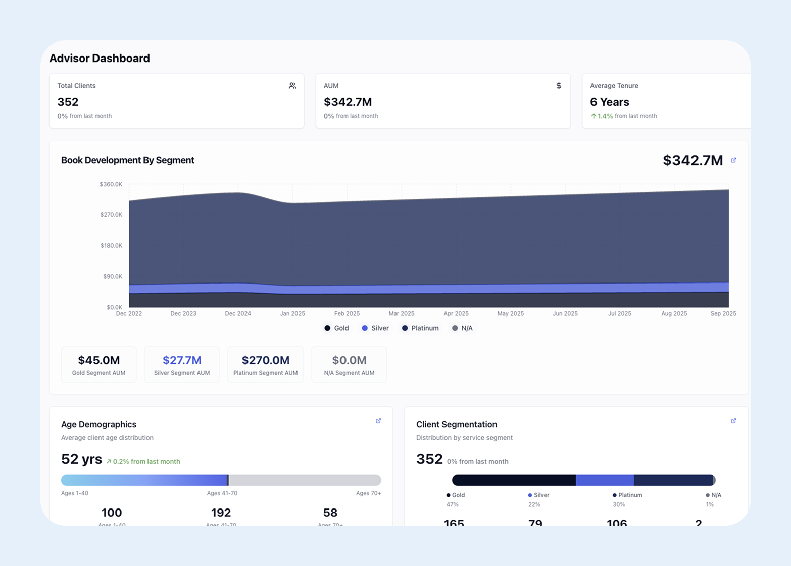 Vitals AI is a business intelligence platform built for financial advisors. With the Vitals AI integration, Wealthbox users can instantly transform their CRM data into actionable insights that reveal the health and performance of their advisory practice. From client demographics and referral sources to book development and growth trends, key metrics are automatically tracked and visualized, eliminating the need for manual reports or spreadsheets.