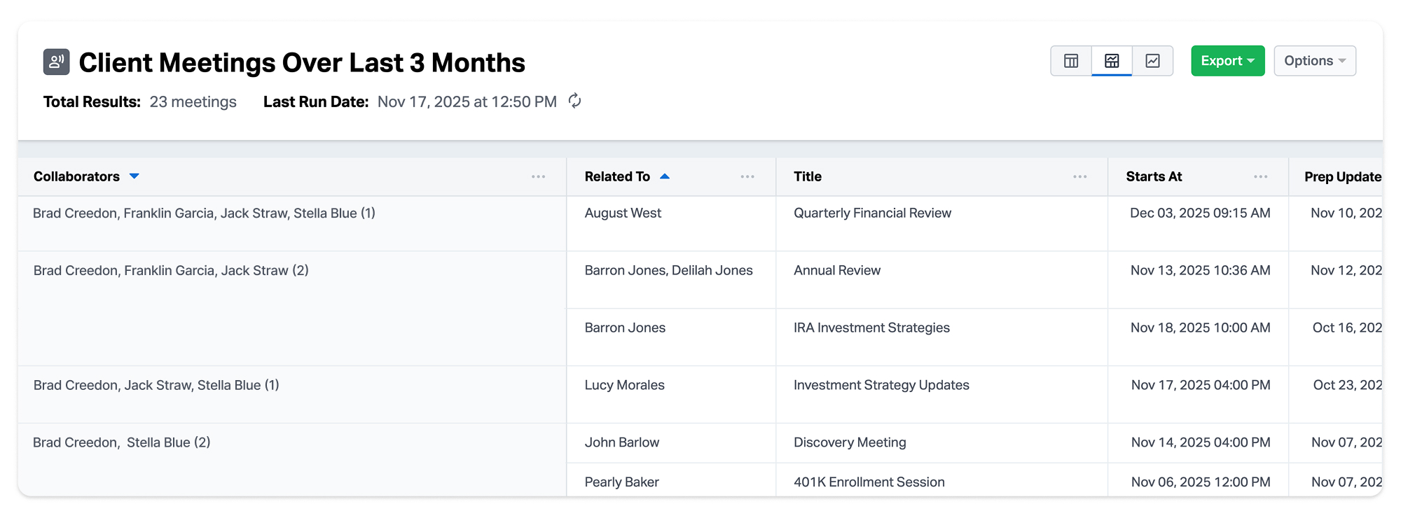 With the introduction of the Meetings report object, advisors can now create reports specifically focused on client meetings. These reports work just like any other report type in Wealthbox, allowing users to apply filters, group data, and display key meeting details that matter most to their practice.