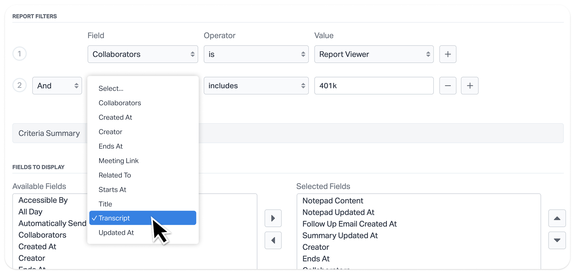 To create a Meeting Report, simply choose “Meeting” as your report object and apply filters to customize your view. The report dynamically updates based on your selected parameters. For example, you can run a report to see all meetings conducted via Zoom in the past month, find meetings without notes for follow-up review, or filter for specific terms mentioned in AI-generated transcripts to pinpoint key topics discussed with clients.