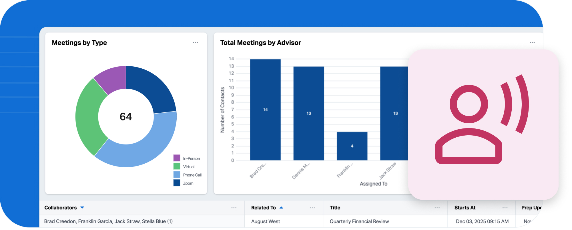 Meeting Reports make it easy for advisors and team leaders to analyze the scope and quality of client interactions, whether it’s reviewing the volume of virtual meetings, ensuring notes are consistently logged, or identifying which team members are most active with clients.
